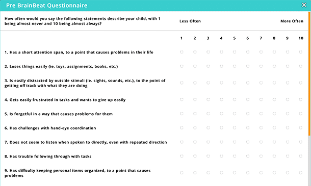 • This questionnaire will be used to gauge the progress your child has made. At the completion of the game, you will be prompted to take the “Post Questionnaire” and will be able to view the gains achieved in the Comparison report.