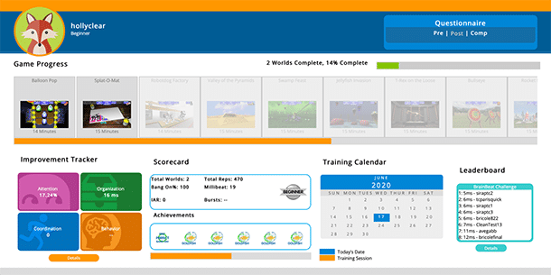As sessions are completed, the Game Progress bar, Improvement tracker, Scorecard, Achievements, Training Calendar, and Leaderboard will be populated.